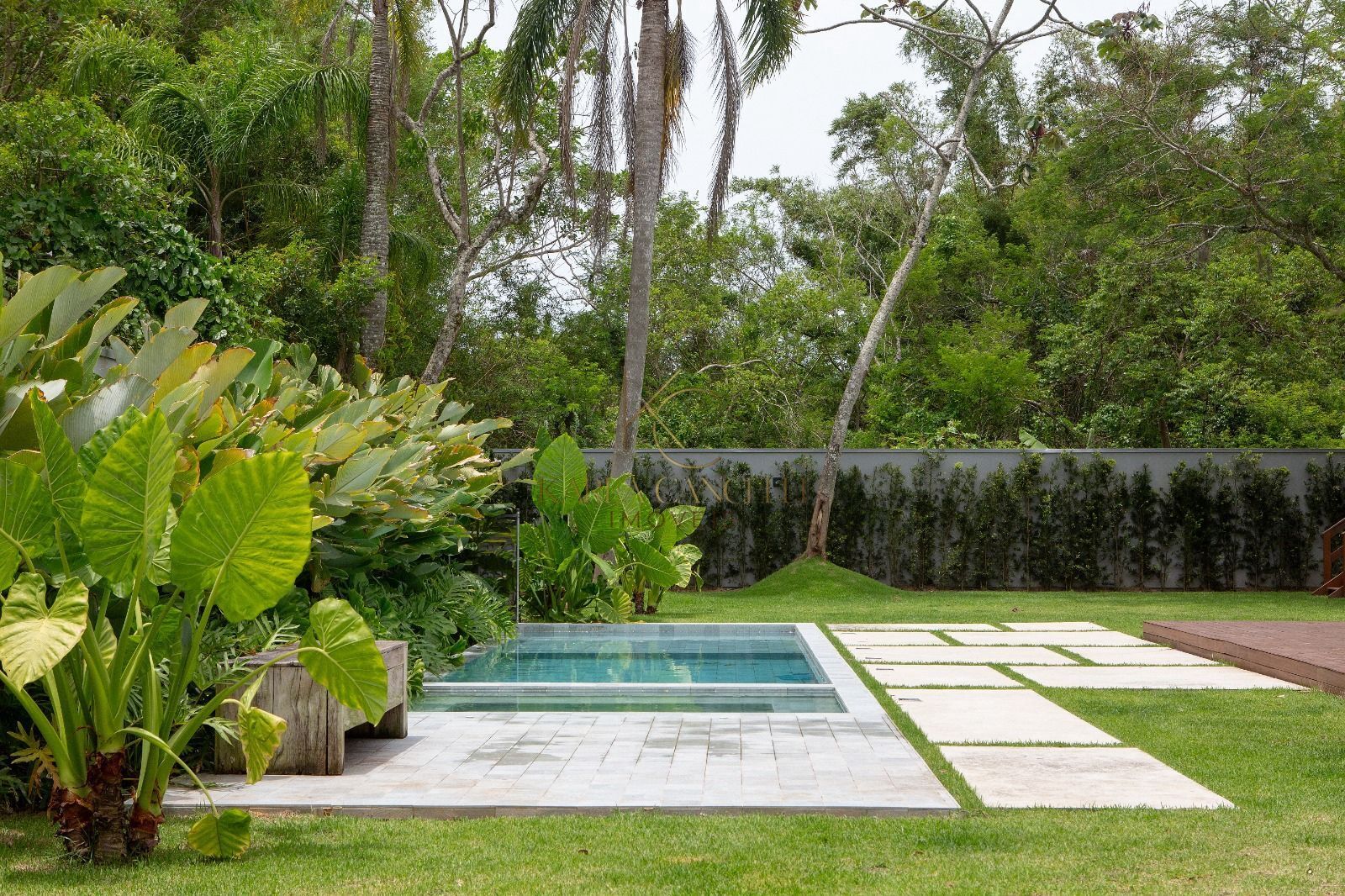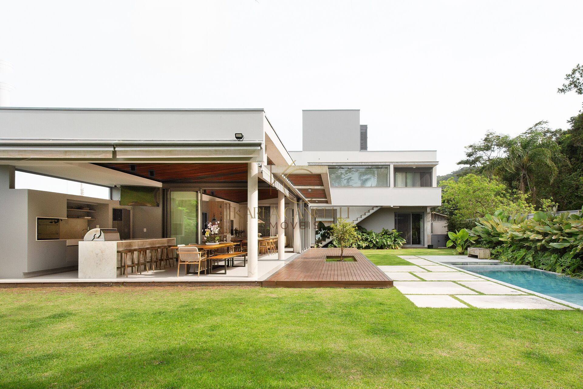 A área externa convida ao lazer e ao descanso, com piscina privativa e uma ampla área gramada, ideal para momentos ao ar livre e para quem valoriza contacto com a natureza.
